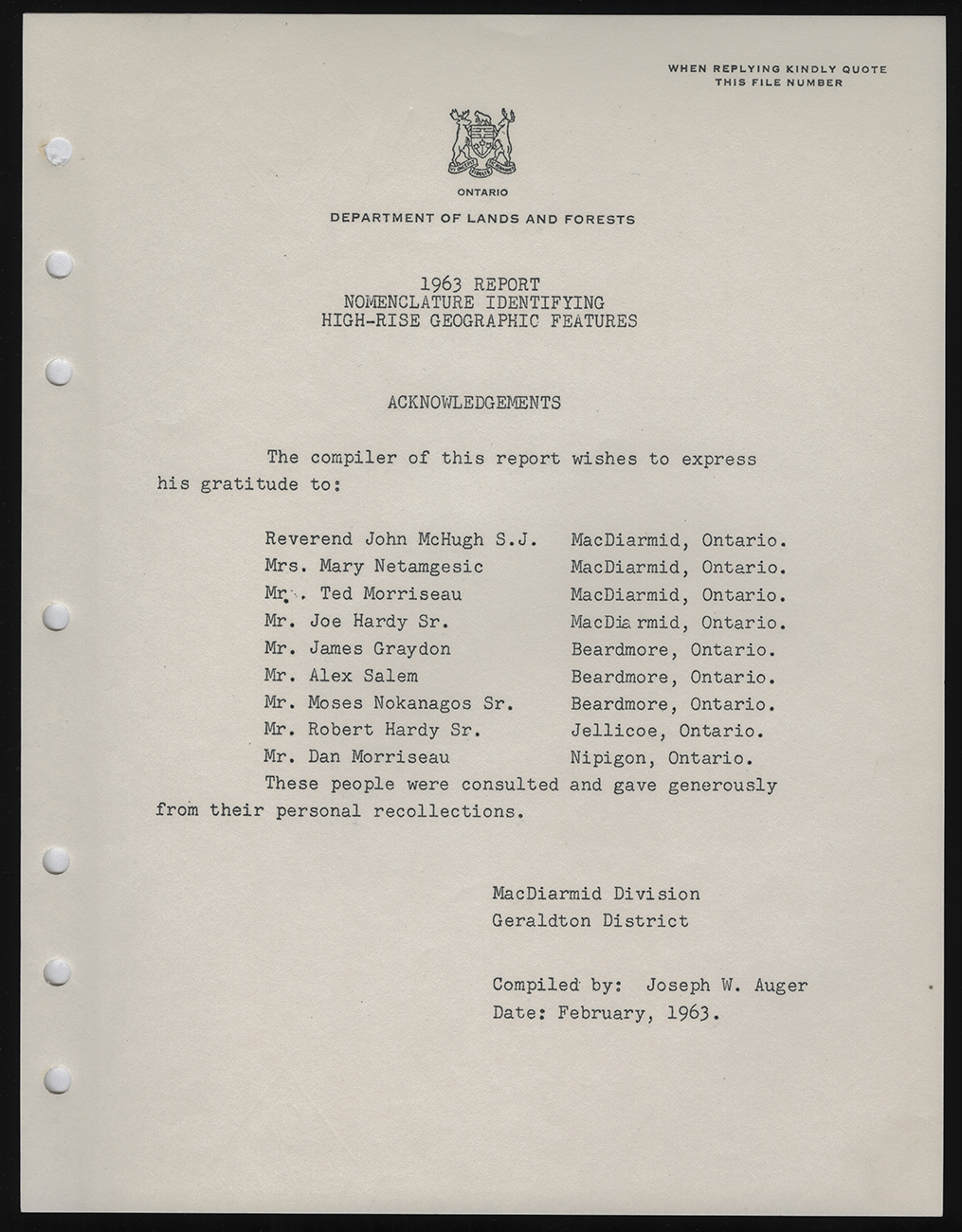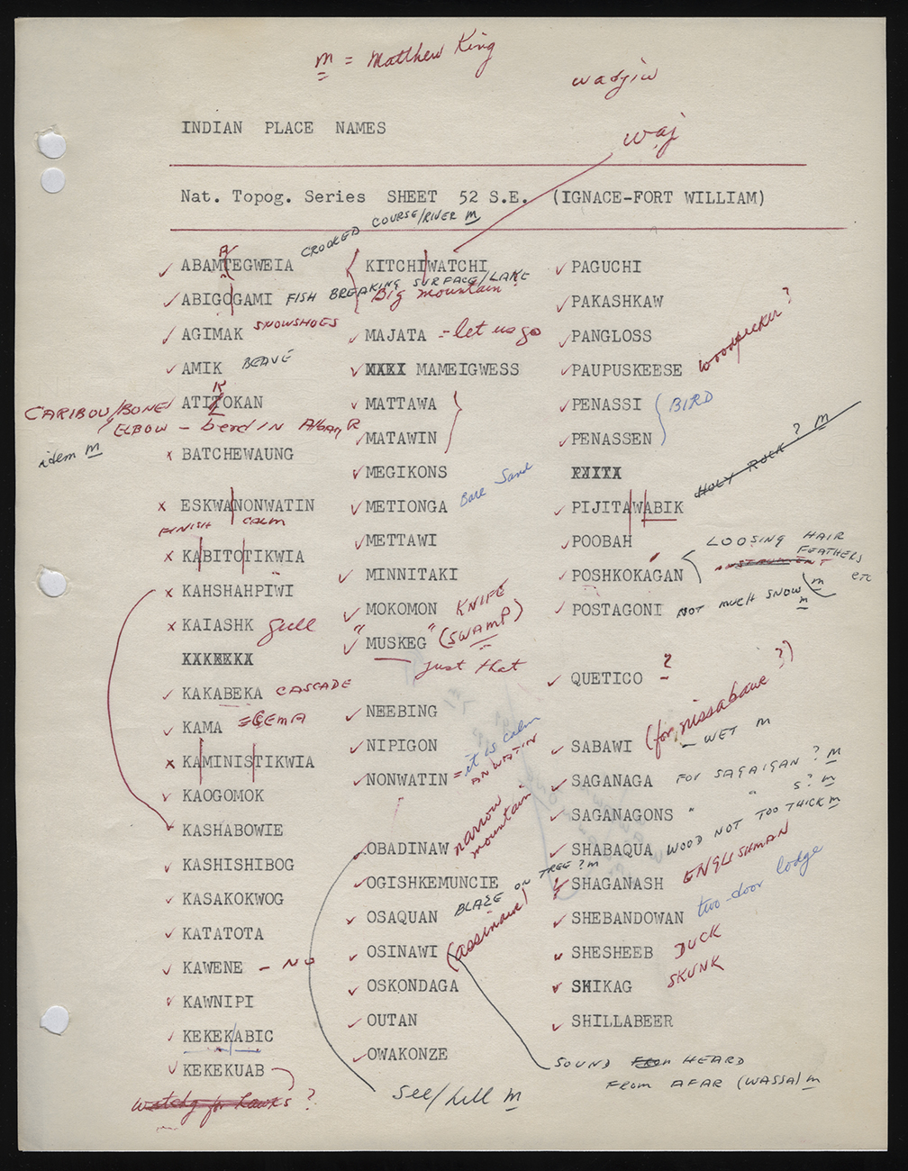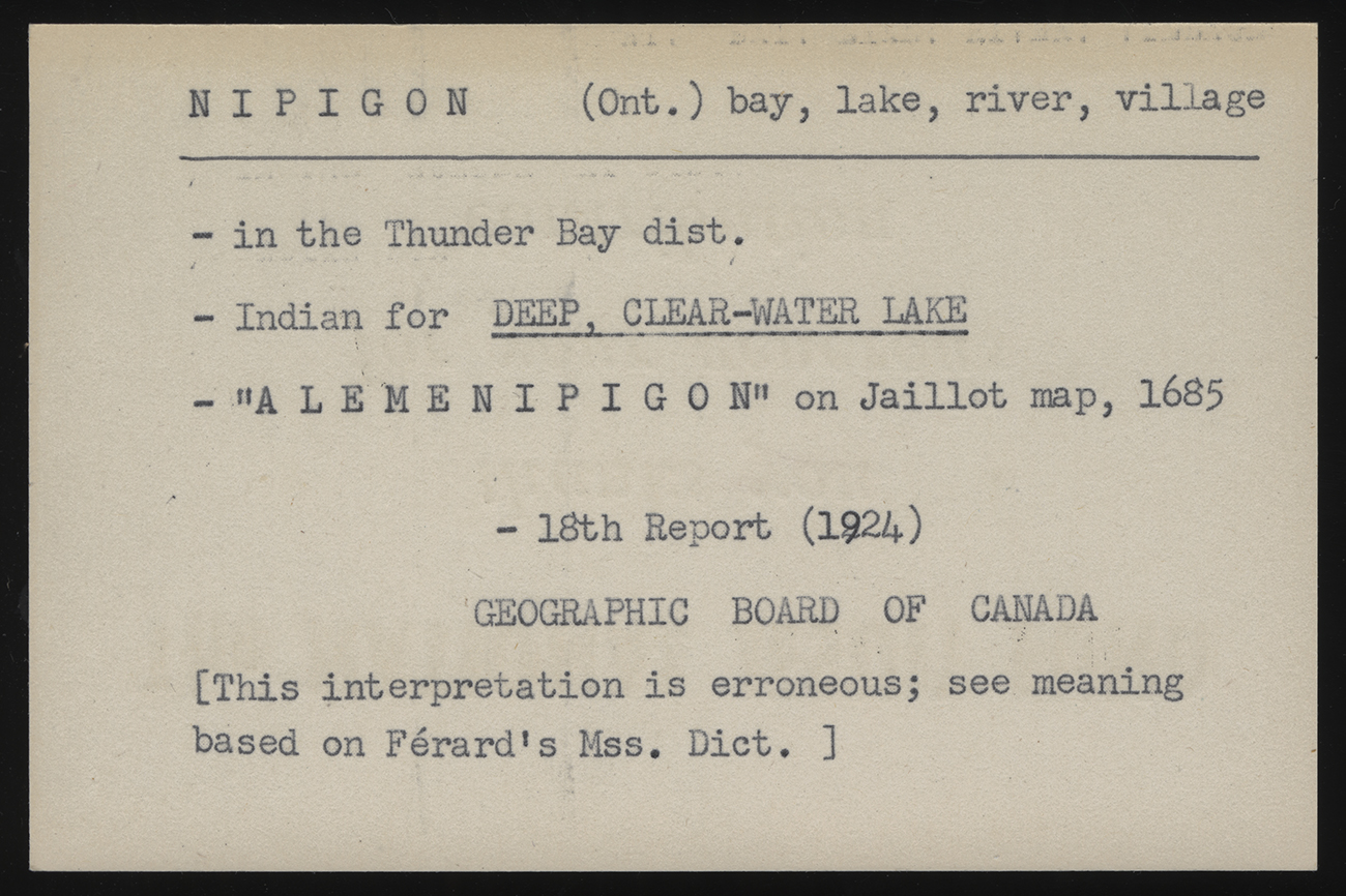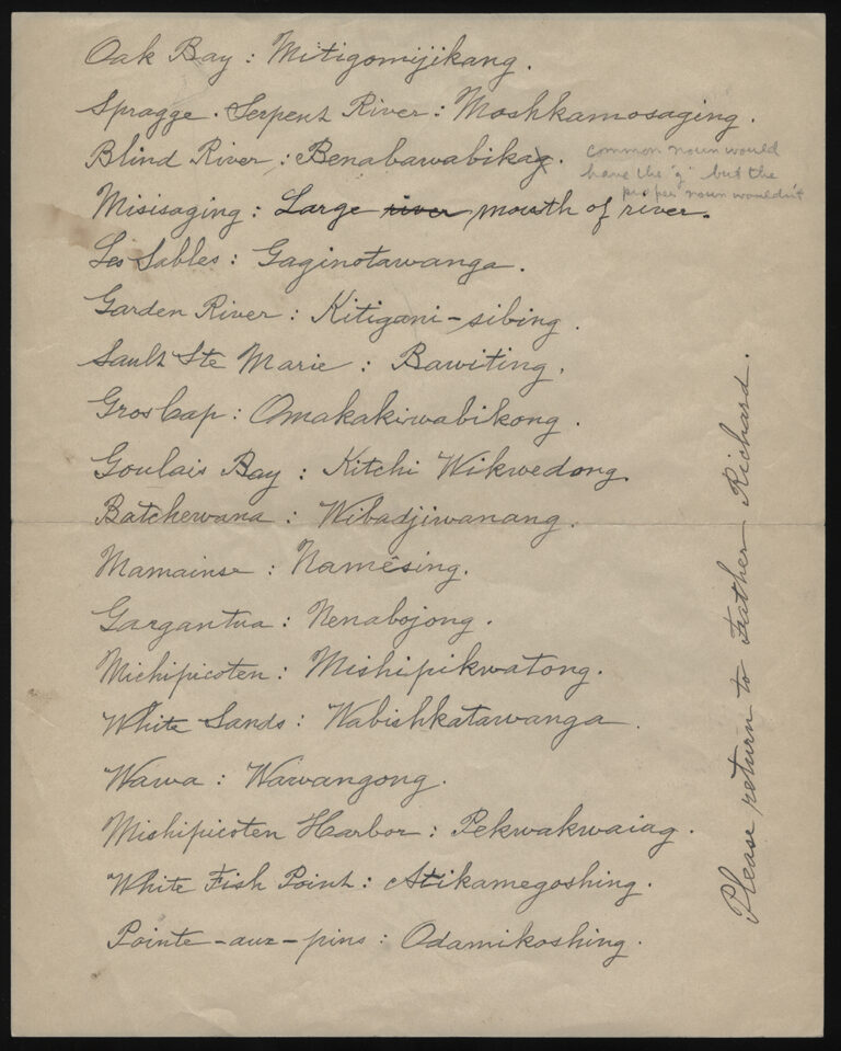 For example, Father F.J. Costello, S.J., corresponded with the Government of Ontario’s Department of Mines and Technical Surveys about the province’s Anishinaabemowin place names.