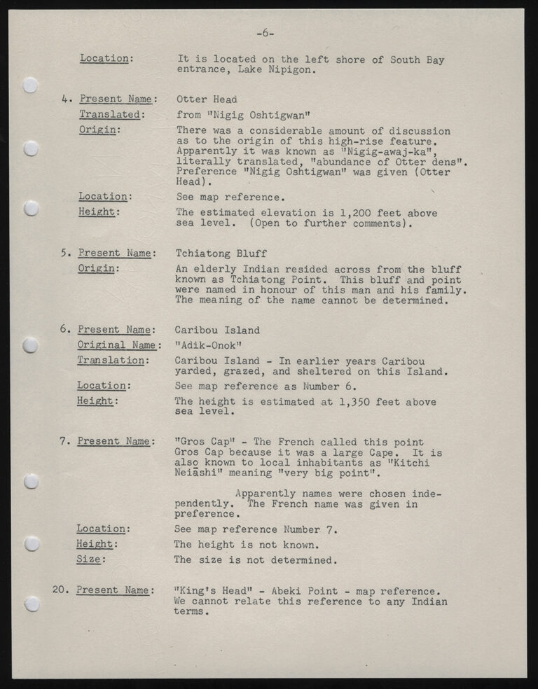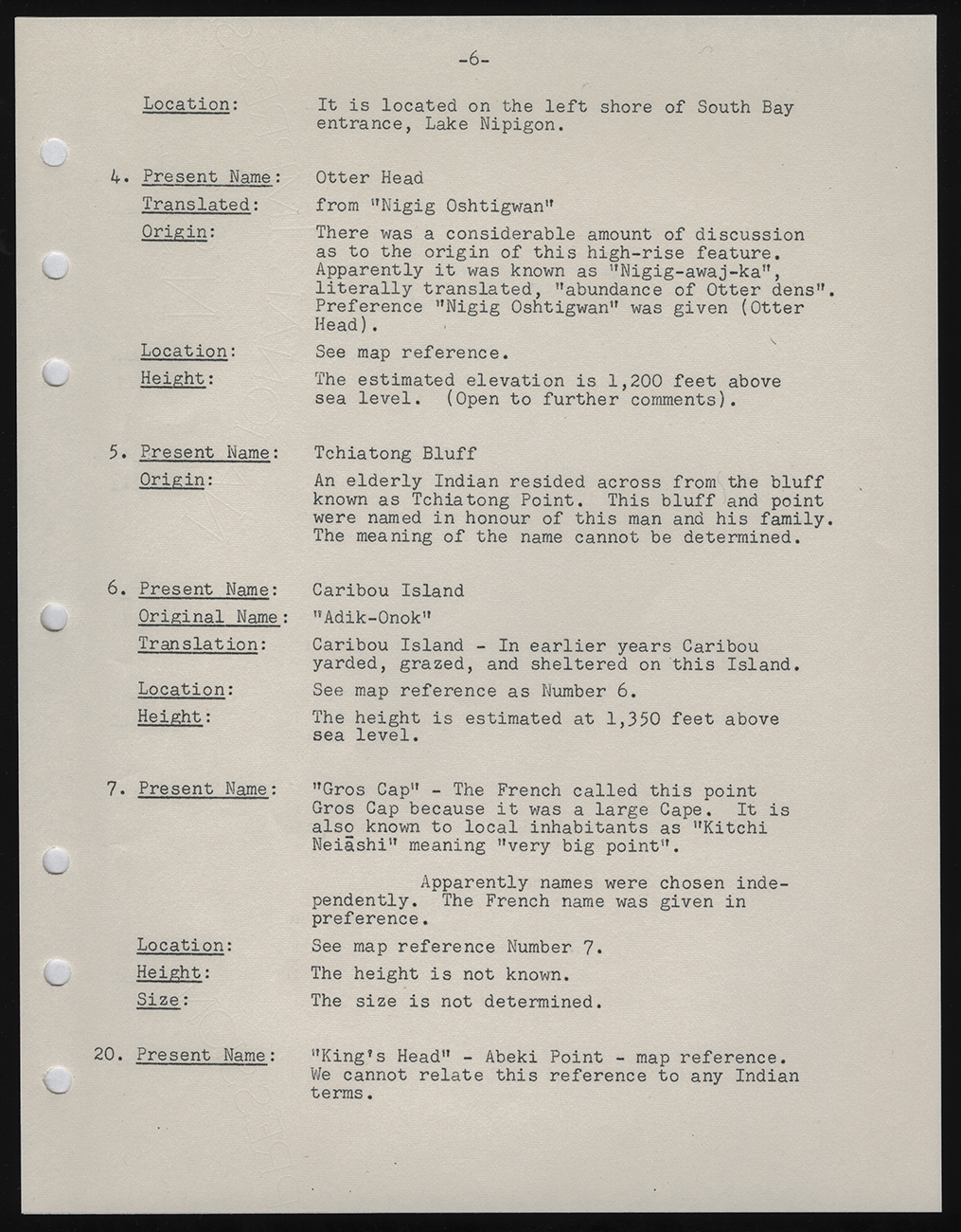 There are also instances of Jesuit involvement in government etymological research. A 1963 Ontario Department of Lands and Forests report identifying the Indigenous names of high-rise geographical features in the province acknowledges Father John McHugh’s contribution to the report as a consultant. The document provides detailed information on the Anishinaabemowin names of mountains and other high-rise features in Ontario, such as Otter Head, which is noted to have derived from “Nigig Oshtigwan.”