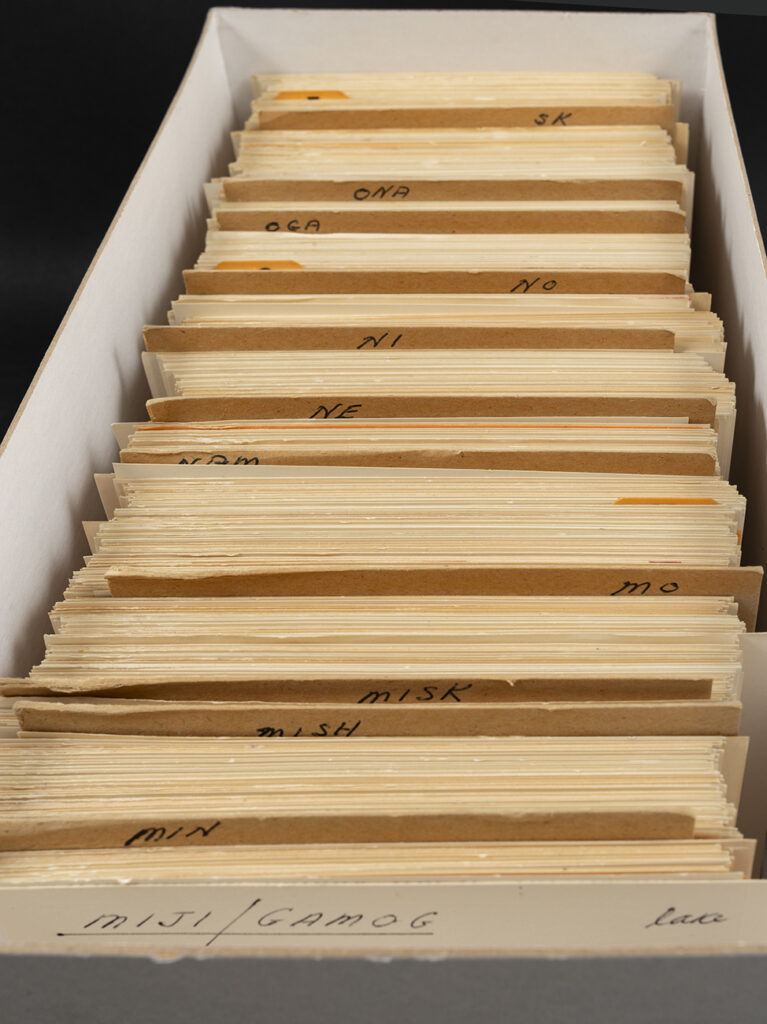 The Jesuits created an extensive indexing system to contextualize place names, personal names, and other words. The index cards, which are part of the collection, often point to textual sources written by Jesuits, as well as other language resources. The languages of both the words and references on each card range widely, from English and French to Anishinaabemowin, Cree, and other Indigenous languages.